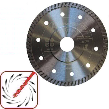 В результате появился промежуточный тип дисков, который называют турбо или турбированный. По сути это сплошной диск с утолщенной рабочей поверхностью и нанесенными по обе стороны насечками. Частота насечек определяет назначение диска. Частые и узкие насечки увеличивают чистоту реза, диски такого типа используются для работы с керамогранитом, мрамором. Редкие и широкие насечки повышают производительность, и такие диски используются для производительной резки бетона.